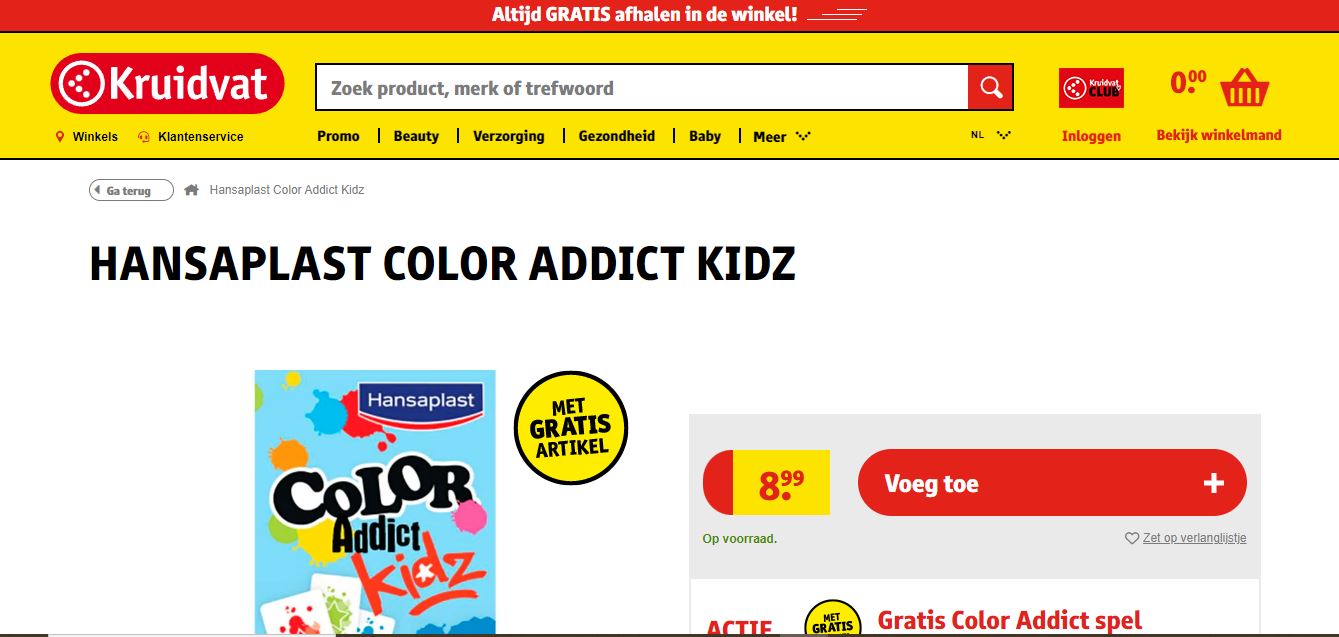 Bij Kruidvat hebben we een fantastische actie voor jou! Wanneer je een Hansaplast product koopt, krijg je een gratis Color Addict spel cadeau. Color Addict is een kleurrijk en spannend kaartspel dat perfect is voor gezellige avonden met vrienden en familie. Het spel is eenvoudig te leren en biedt urenlang speelplezier voor jong en oud. Grijp deze kans om je spelcollectie uit te breiden met een gratis en leuk spel!